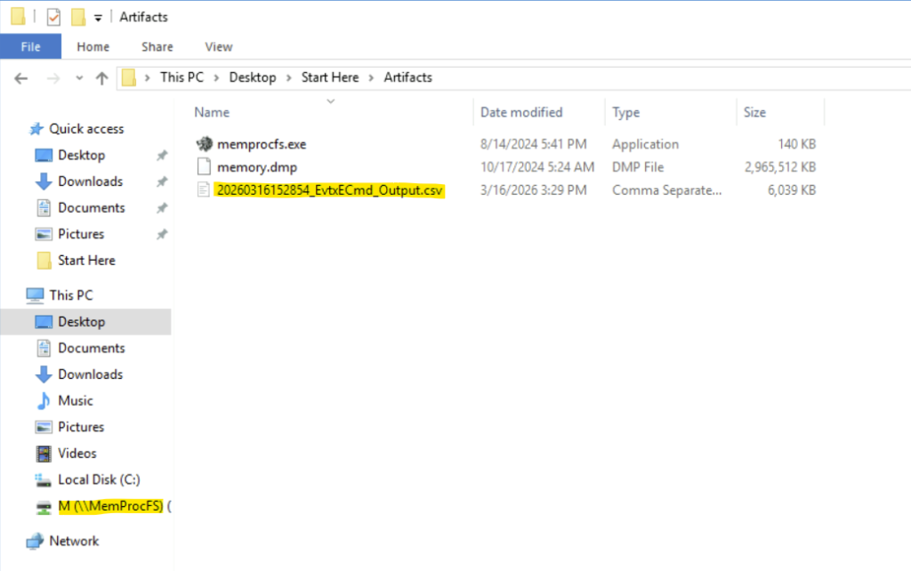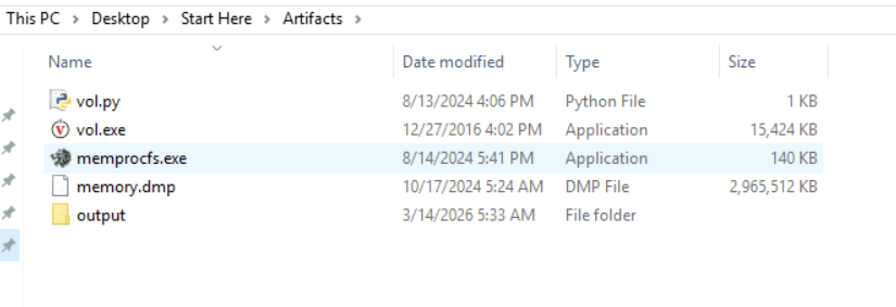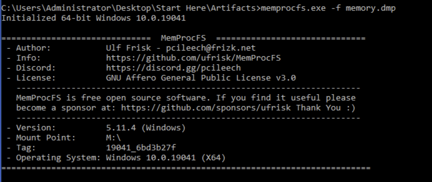 Step 3: We can use memprocfs here. Memprocfs is a tool that lets us analyze memory dumps like a normal file system. It mounts memory as a folder/drive.