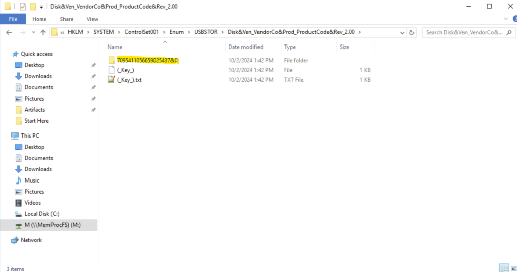 Step 5: To find the serial number of the USB device, we must traverse to the device list under M drive.- M:/HKLM/SYSTEM/ControlSet001/Enum/USBTOR/Disk&Ven_VendorCo&Prod_ProductCode&Rev_2.00/