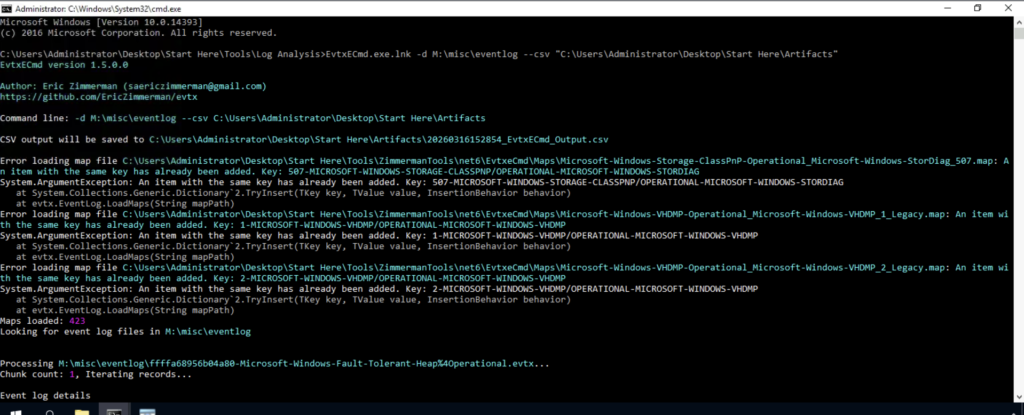 The event log is present in M:\misc\eventlog and we can use the following command in cmd to create the csv file.