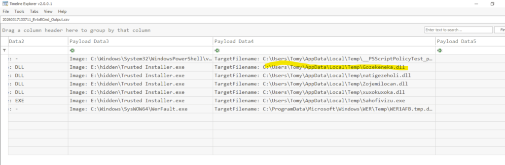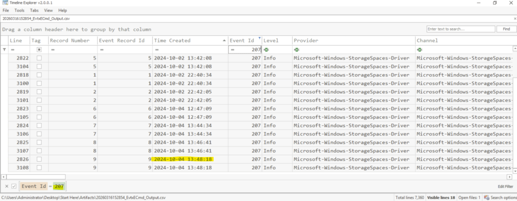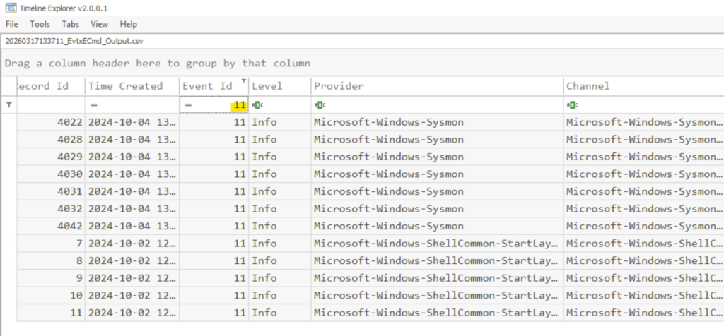 From the timeline explorer, we can filter the event id’s with 11 which means file creation events.