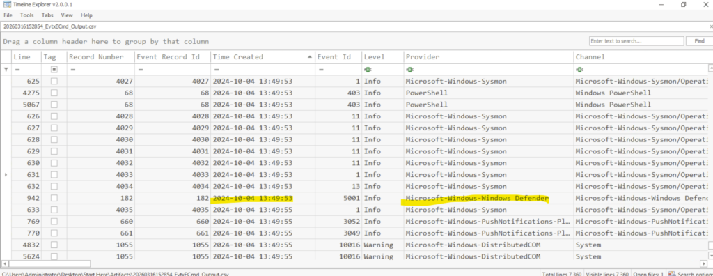 We can use the timeline from the previous question and use it to find the answer. We can scroll down and search for the provider ‘Windows Defender’. Against it we will get the full path of the executable that disabled the Windows Defender protection.