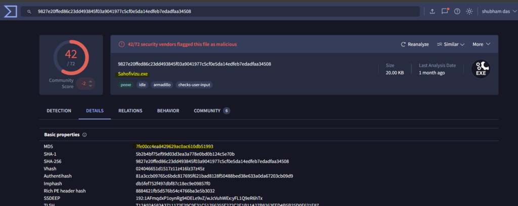 We can use VirusTotal to find the MD5 of the malicious executable.