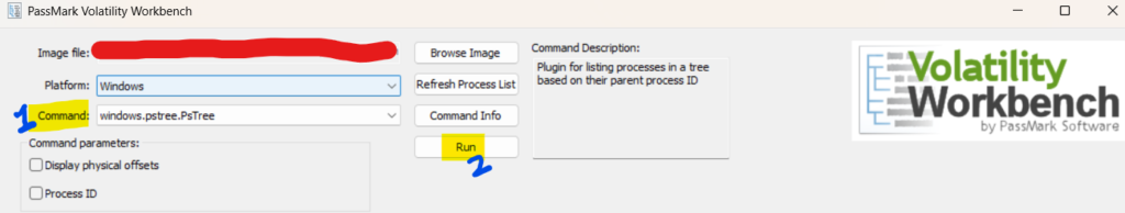 Step 4: Now we must find the process that is responsible for suspicious activity. To find the process, we need to select the Command ‘windows.pstree.PsTree’ from the drop-down menu.