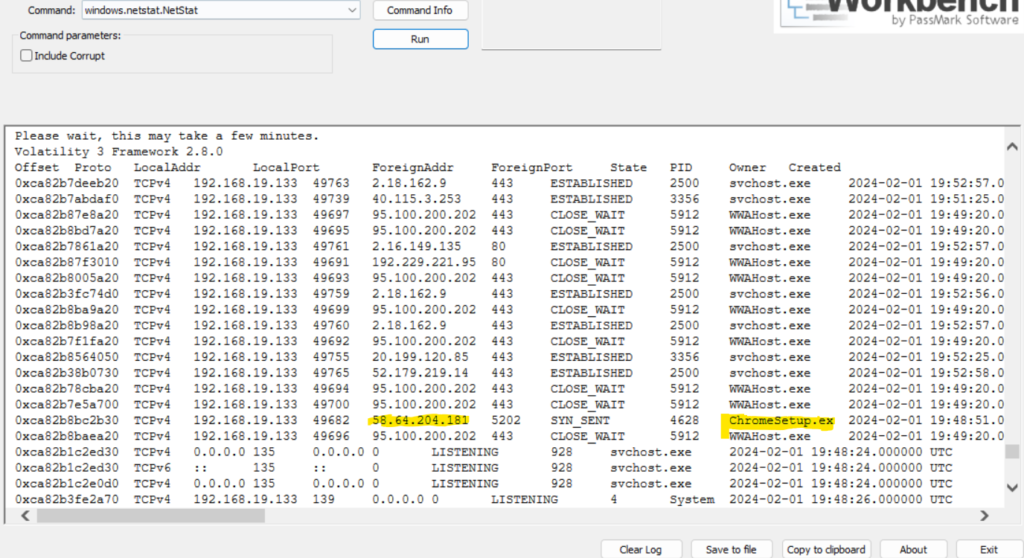 Step 7: Identifying network connections is crucial for understanding the malware’s communication strategy. So how to find what IP address did the malware attempt to connect to? This can be done using the ‘windows.netstat.NetStat’ plugin. Select the plugin from Command and select Run. Under the ForeignAddress column, corresponding to the ChromeSetup.exe process. This will tell us the IP Address that the malware communicated with.