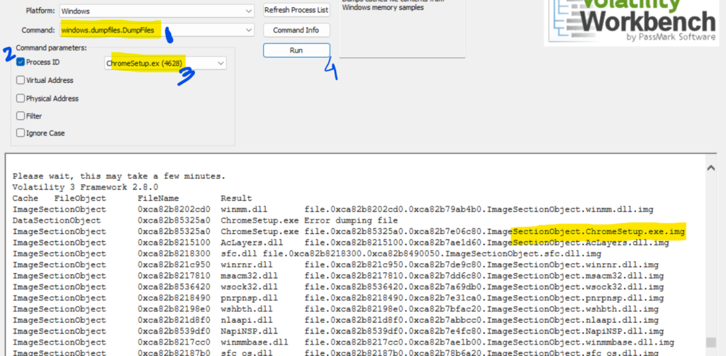 Step 9: Hashes serve as unique identifiers for files, assisting in the detection of similar threats across different machines. We can get the SHA1 hash of the malware under the disguise of ChromeSetup.exe also. How? Well, what we can do is first dump the file using the ‘windows.dumpfiles.DumpFiles’ plugin and the mention the procees id which in this case is 4628. Then hit Run.