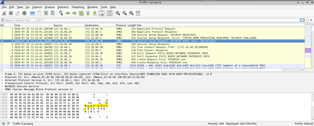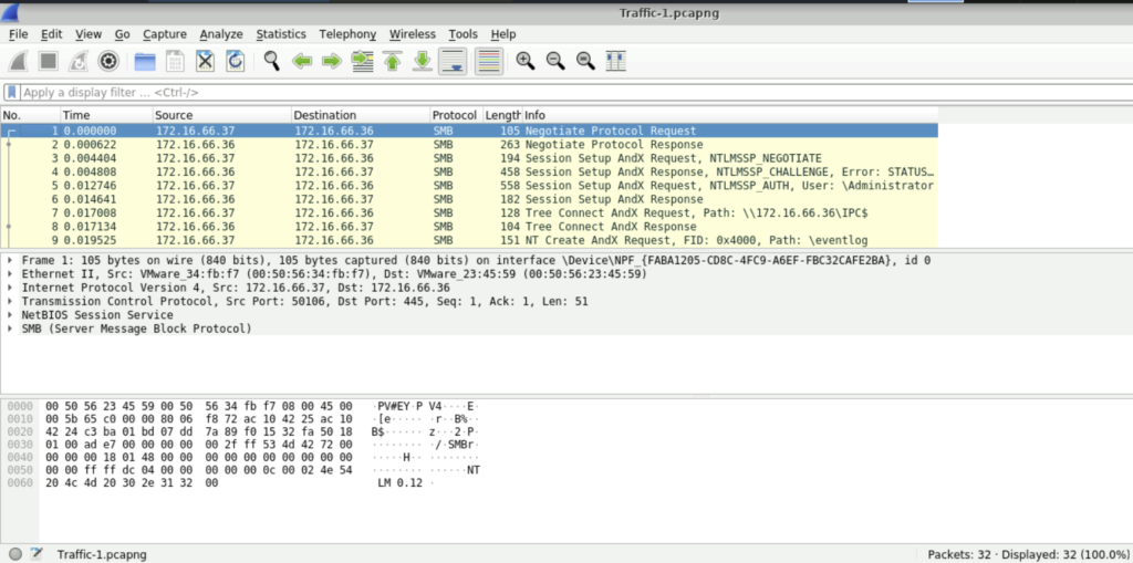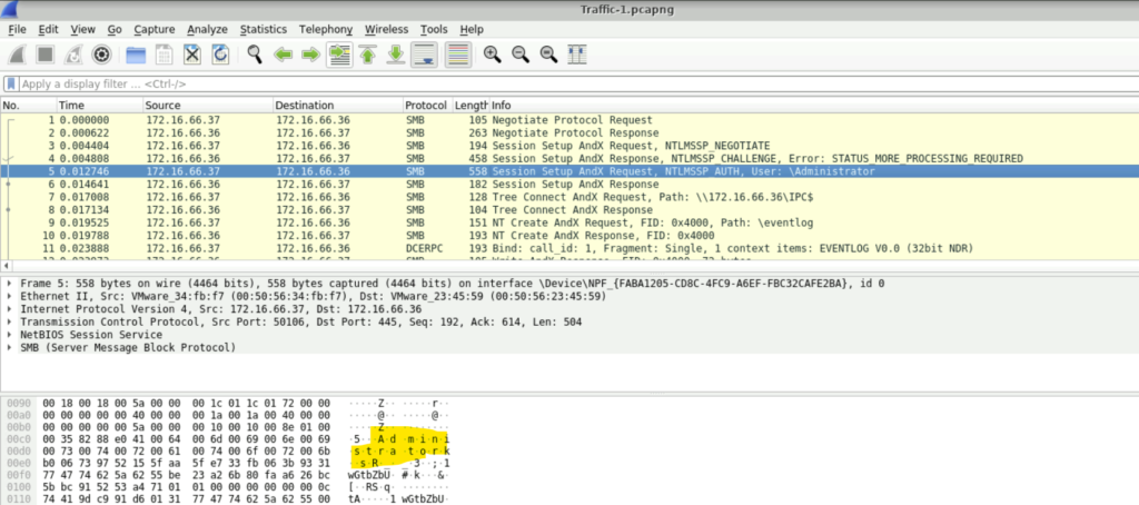 Step 1: Just after a few packets, we can see that the User name that was used for authentication is Administrator.