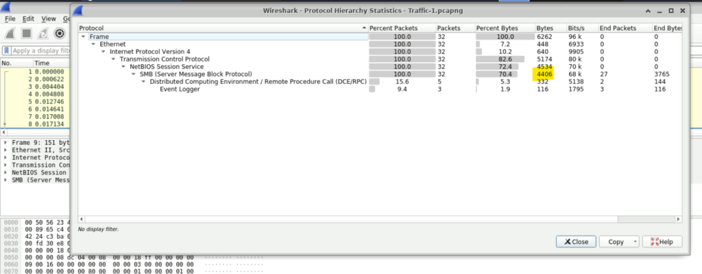 Step 2: The first step is to examine the Protocol Hierarchy of the captured file. The Protocol Hierarchy provides a high-level overview of the traffic by listing all protocols used and the amount of data exchanged by each protocol in a structured, tabular format.