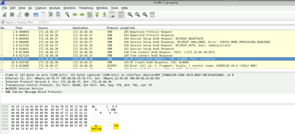 Step 1: A few packets later, we can see the Path of the file opened. Yes it is eventlog.
