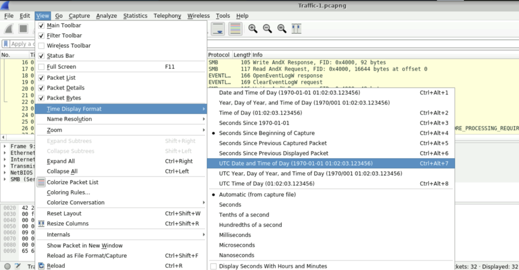 Step 1: By default, the time format in Wireshark is not given in 24-hour UTC format. So we need to set it in that way. To do this. We must select View and then select Time Display format.
