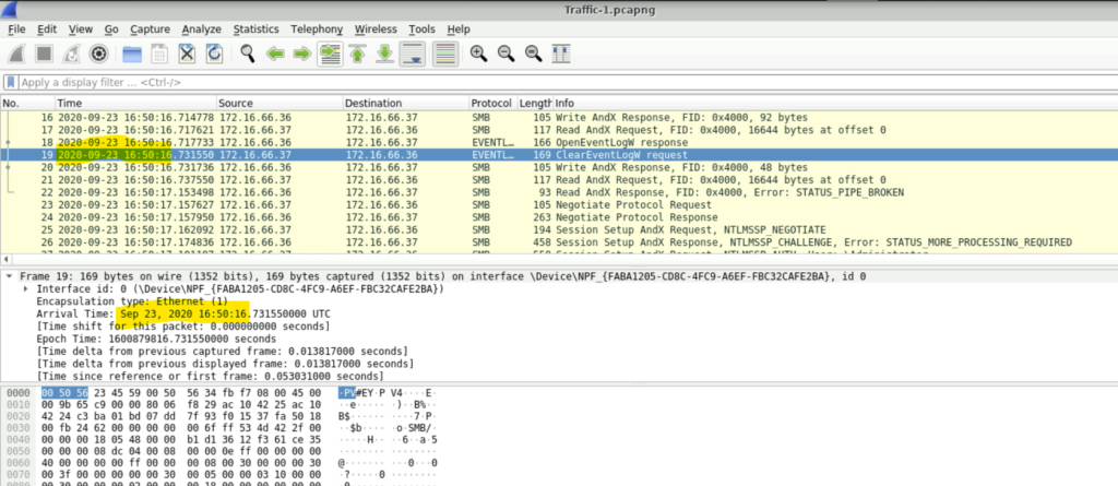 Step 3: In the question, we are asked to find the timestamp of the attempt to clear log. If we scroll down a bit, we will see a ClearEventLog request. We just need to note the timestamp which is Sep 23, 2020 16:50:16 UTC.
