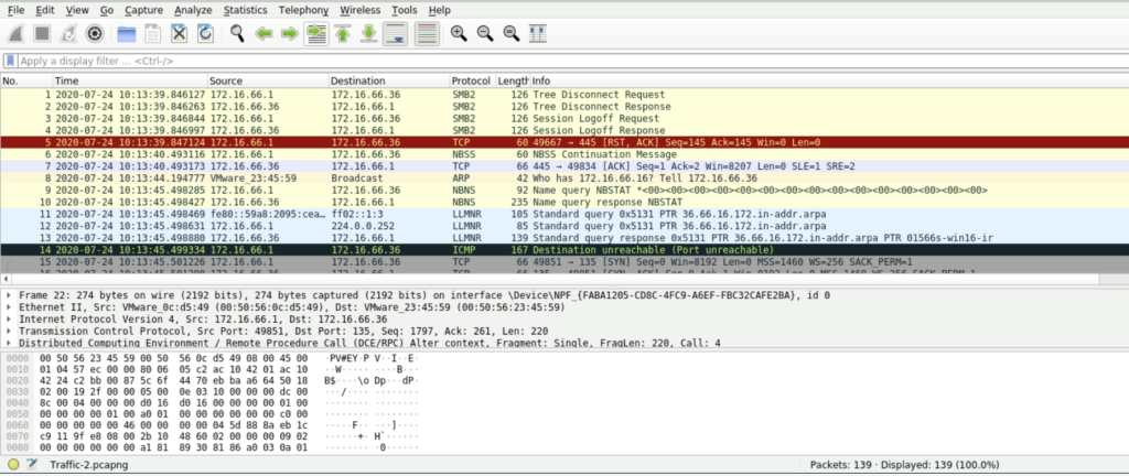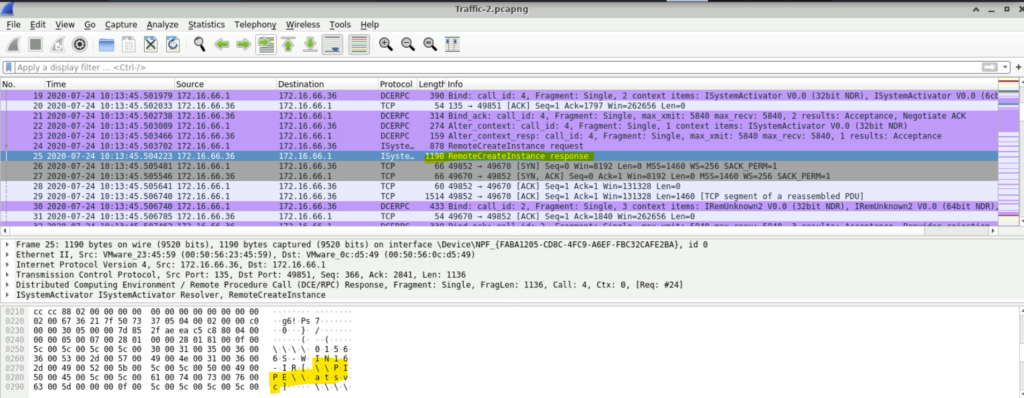 Step 2: Scrolling down we see that there is a RemoteCreateInstance response packet. If we select that packet and examine the Packet Bytes pane, we will find the name of the pipe which here is \\PIPE\\atsvc.