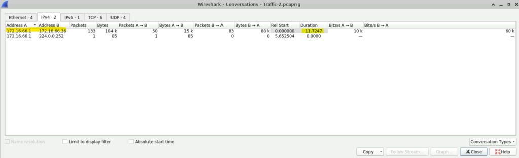 Step 2: Select IPv4 and in there we will find the duration of communication between 172.16.66.1 and 172.16.66.36, which is 11.7247.