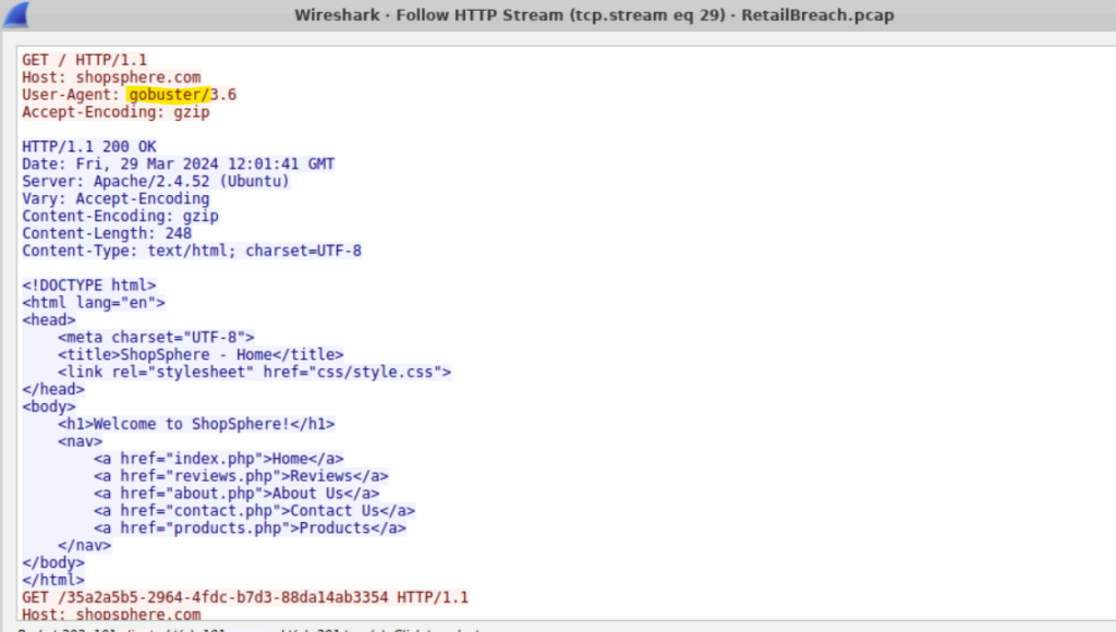 Step 2: Right-click on any http GET packet. Follow the packet with http-stream and check the user-agent. We will see the tool used ‘gobuster’.