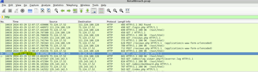 Step 1: This we can see just when the admin visited the dashboard.php after reviews.php at 2024-03-29 12:09.