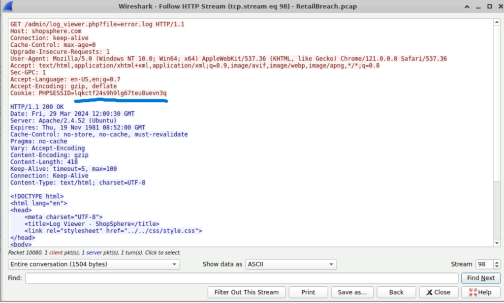 Step 1: So we need to find the session token acquired by the attacker. This can be done by following the http stream of log_viewer.php.